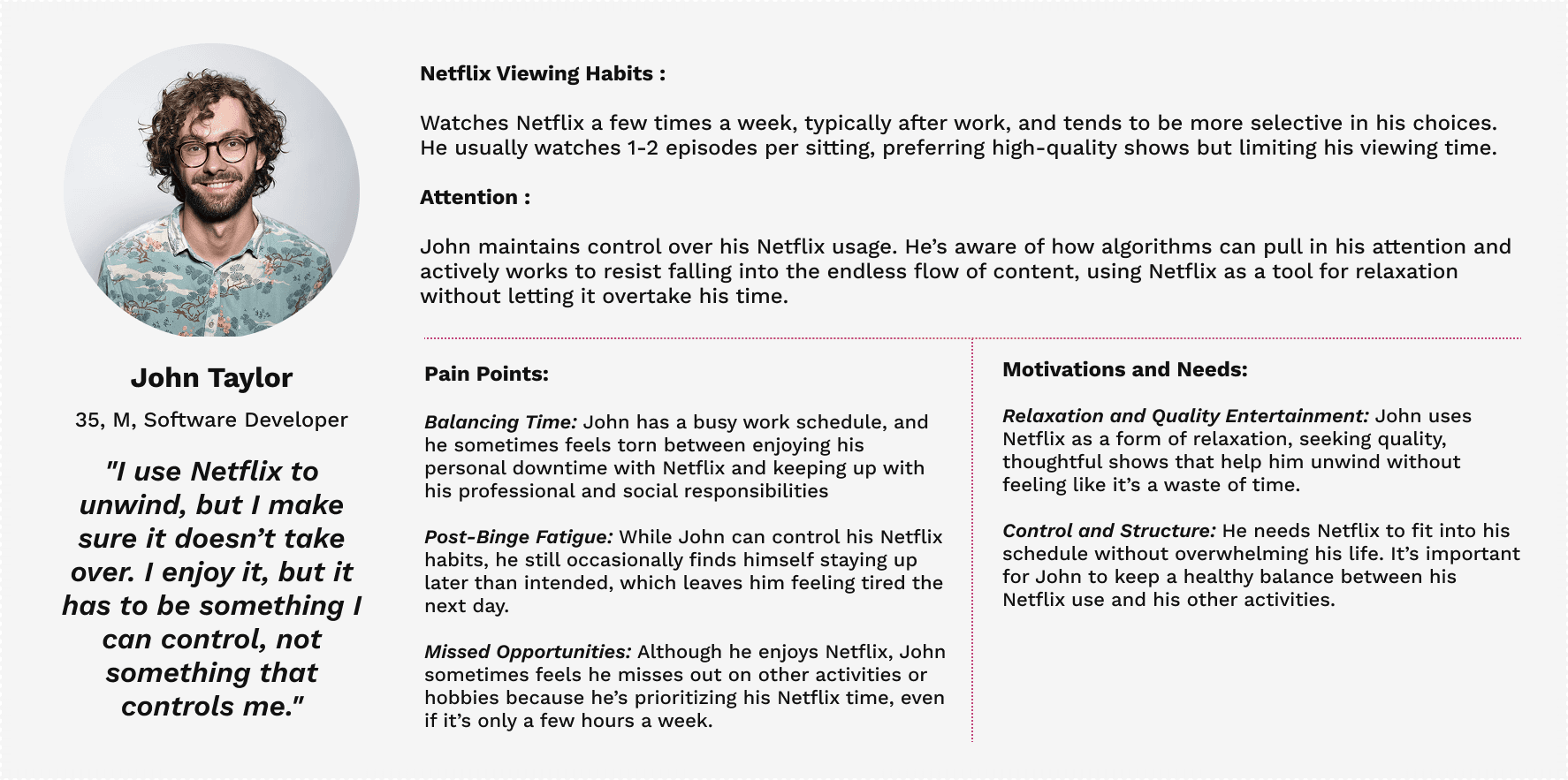 Interviewing real users was a key part of developing authentic and relevant personas for my mindfulness prototype. Through these conversations, I gained valuable insights into their daily routines, stressors, and personal approaches to mindfulness. This allowed me to move beyond assumptions and create user personas that truly reflect the needs, motivations, and challenges of the people I’m designing for—ensuring a more empathetic and user-centred solution.